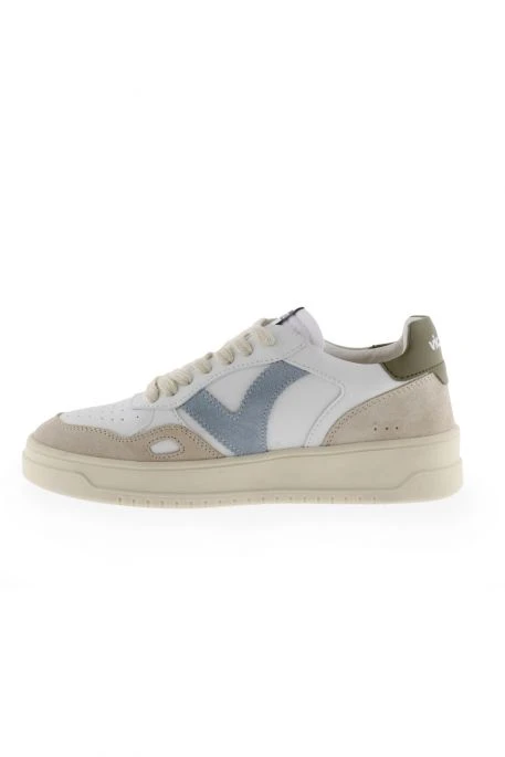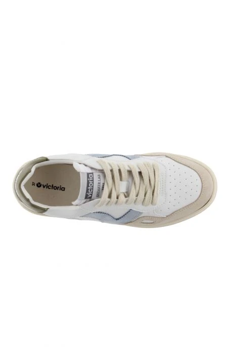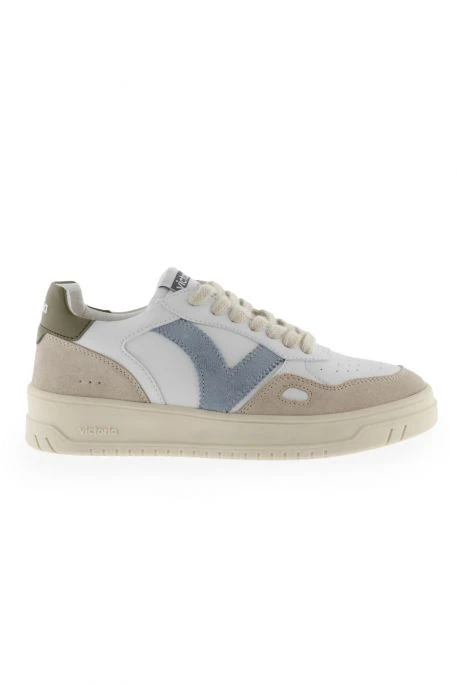 Bakets Seul Vcitoria femme. Basket femme et homme fabriquées dans une matière effet cuir avec des pièces en cuir fendu sur la pointe, le talon et V rétro de victoria. Semelle légèrement beige de 3.5 cm avec lacets assortis. Semelle intérieure matelassée pour le confort.