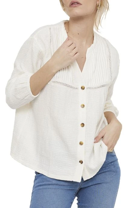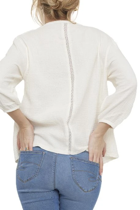 Blouse Lee Cooper Digny, blouse en gaze de coton manches 3/4, encolure en V avec un col tunisien.