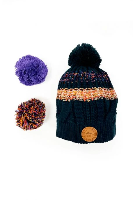 Bonnet de la marque Fonem. Bonnet de couleur grise. Trois pompons de couleurs différentes interchangeables grâce à un aimant.