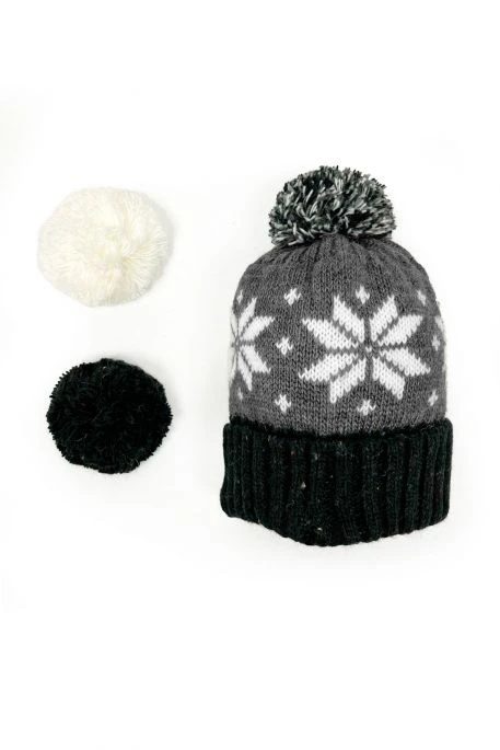 Bonnet de la marque Fonem. Bonnet de couleur noir et grise avec des étoiles blanches. Trois pompons de couleurs différentes interchangeables grâce à un aimant.