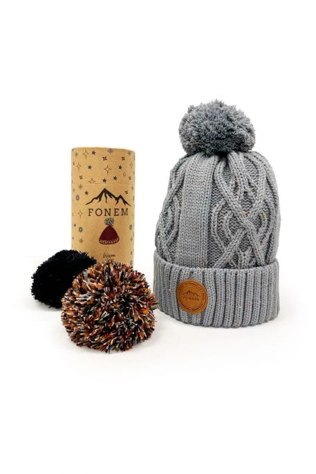Bonnet de la marque Fonem. Bonnet de couleur grise. Trois pompons de couleurs différentes interchangeables grâce à un aimant.