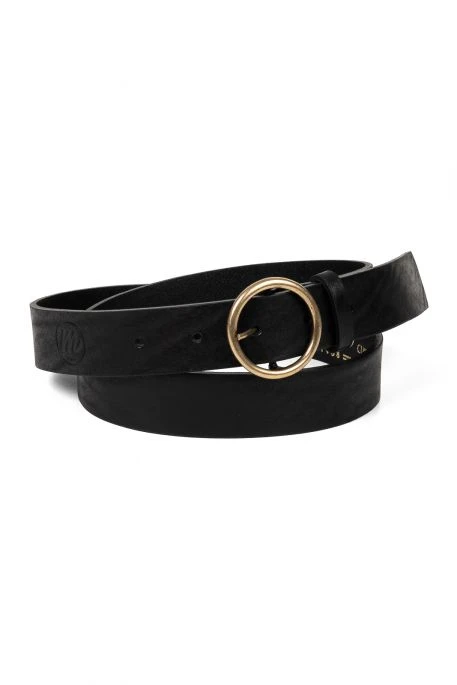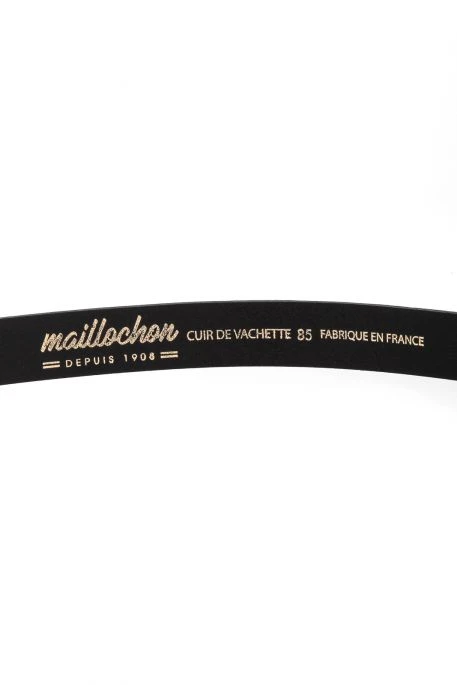 Ceinture Maillochon Ceres pour femme. Ceinture en cuir de vachette, boucle ronde en acier et logo « M » de Maillochon embossé, tranche arrondie de couleur noir.