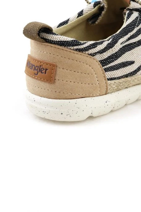 Chaussure Wrangler pour femme, chaussure à l’esprit espadrille, motif zébré, fermeture lacet élastique, belles finitions, patch Wrangler en cuir à l’arrière,
