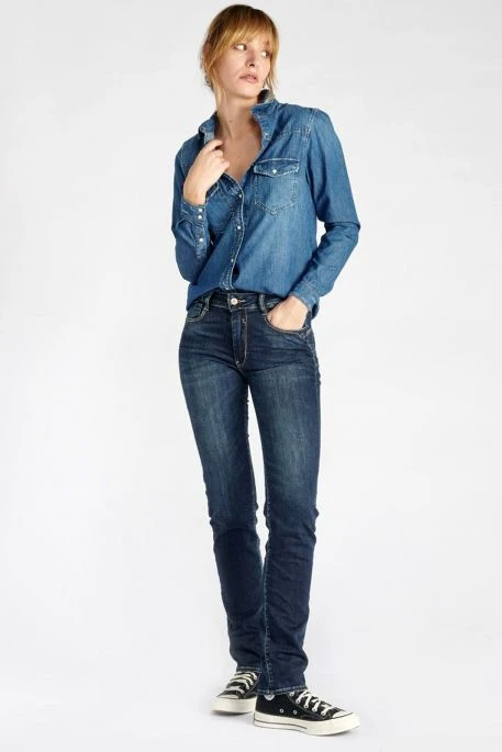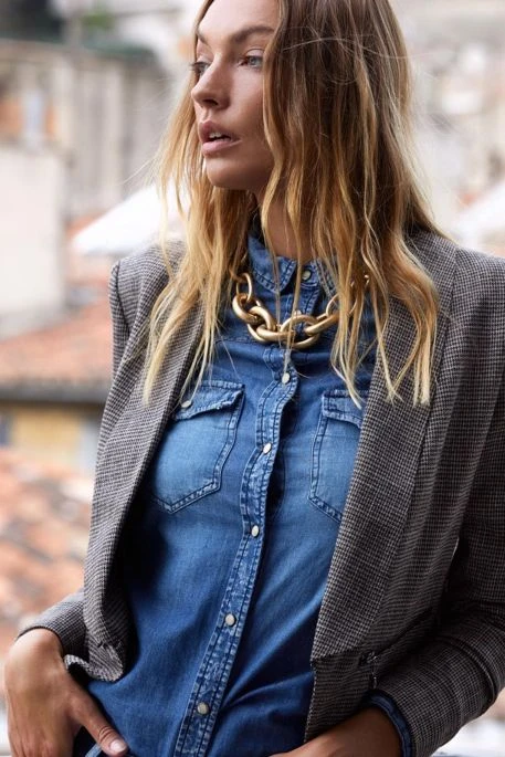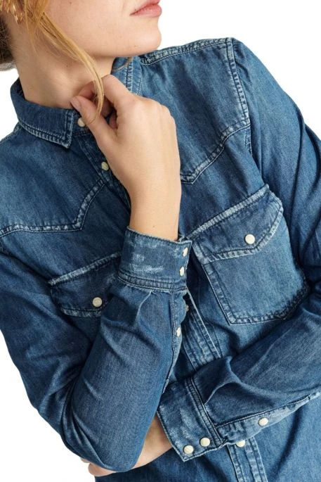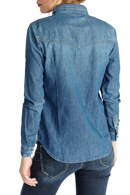 Chemise en jean pour femme signée TDC, chemise avec 2 poches poitrine, coupe slim, fermeture boutonnée par pressions, base arrondie