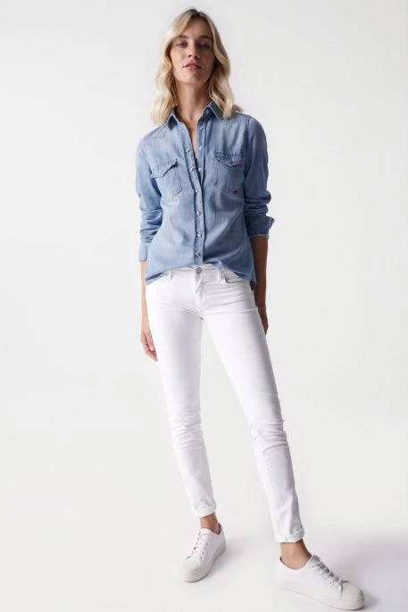 Chemise Salsa pour femme de coupe slim en coton. chemise avec boutons-pression, Deux poches poitrine, encolure classique, Boutons-pression de couleur perle