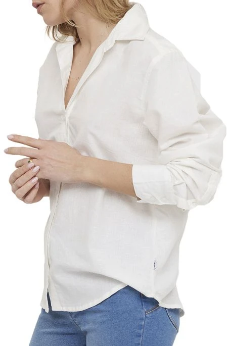 Chemise Lee Cooper Dhimmi pour femme. Chemise manches longues avec col bowling, boutonnée sur le devant et aux manches, coupe loose en coton et lin.