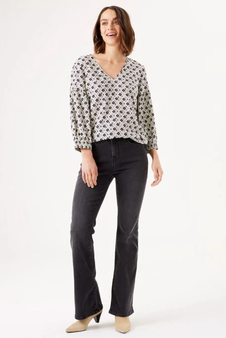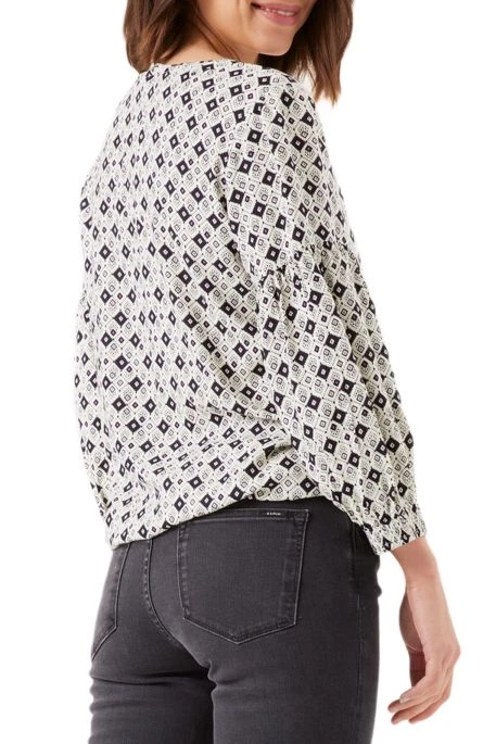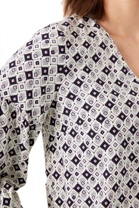 Chemisier Garcia Motif pour femme. Chemisier de coupe ample, manches 3/4 avec base des poignets élastiquée, col en V. Tissu à motifs géométriques sur toute la surface.
