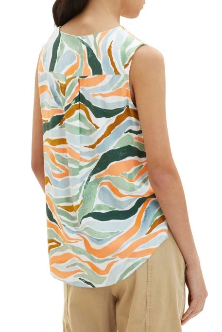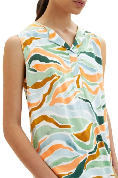 Tee Shirt de marque Tom Tailor pour femme, tee shirt sans manches avec une encolure en V, tee shirt à motifs avec des fentes latérales sur l’ourlet, la coupe est régulière avec des fibres de viscose durables et fines.