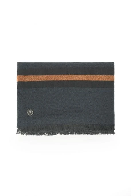 Echrape pour homme de marque TDC, écharpe en chevrons noirs et bleus, les bords sont effilochés, écusson de la marque habille cette jolie pièce.