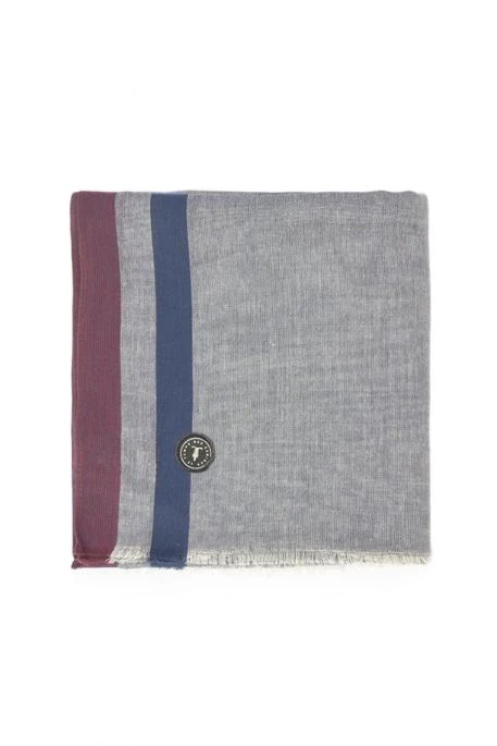 Foulard pour homme signé Le Temps des Cerises, rayures dans les tons aubergine, et bleu marine bords effilochés, très doux et confortable à porter.