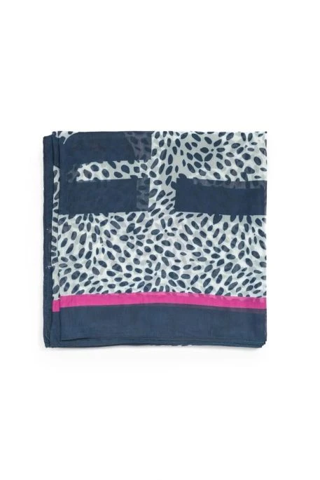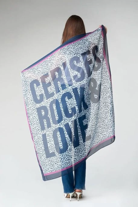 Foulard TDC Vipene pour femme, foulard à motif habilé dans les tons bleu, forme carrée pour ce joli foulard ( 120cm x 120 cm ) et liseré violet tout autour, inscription Cerises Rock and Love !