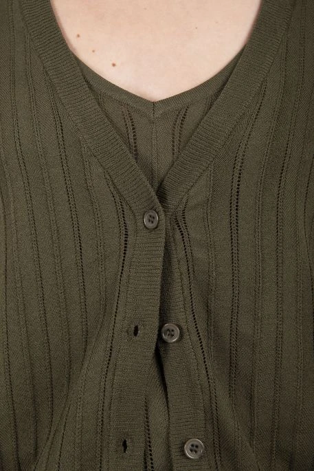 Gilet Teddy Smith pour femme. Gilet en maille fine légèrement ajourée, fermé par des boutons sur le devant. Coupe loose avec manches raglan.