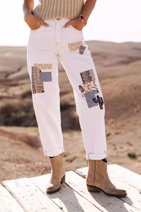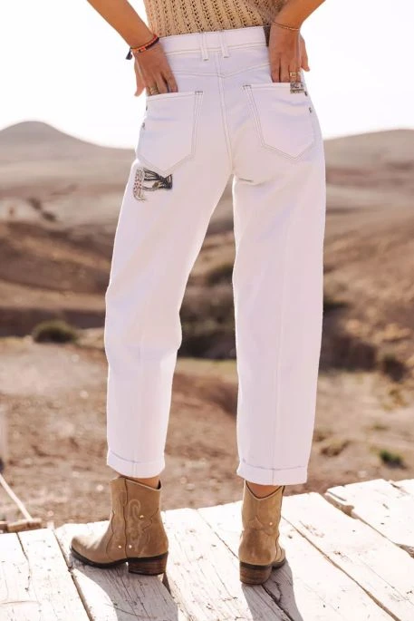 Jean Freeman Porter Maeva Andalousia Off White, ce jean Freeman blanc a une coupe boyfried, c’est à dire une coupe ample sur les hanches et les cuisses, qui se resserre en bas.