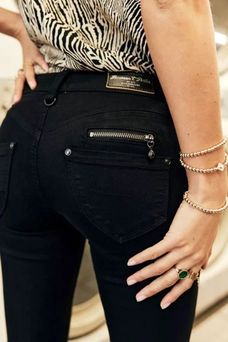 Jean Freeman T.Porter Alexa Slim pour femme. Jean de coupe slim, taille normale, fermeture par bouton et braguette zippée. Tissu super stretch, effet gainant et ultra confort. Zips sur les poches.