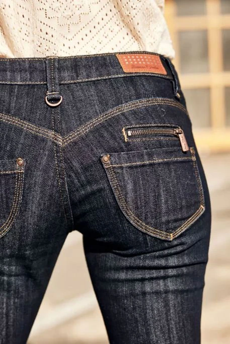 Jean Freeman T.Porter Alexa Slim pour femme. Jean de coupe slim, taille normale, fermeture par bouton et braguette zippée. Tissu super stretch, effet gainant et ultra confort. Zips sur les poches.