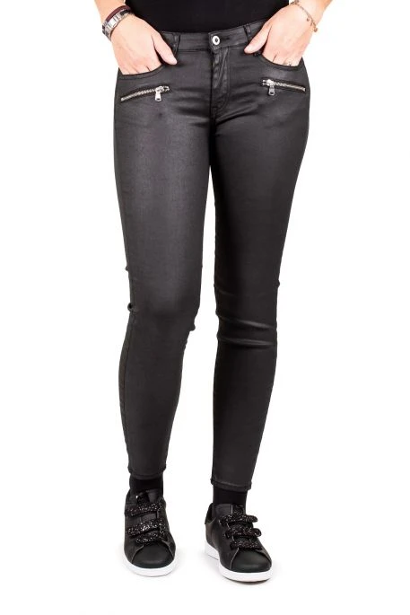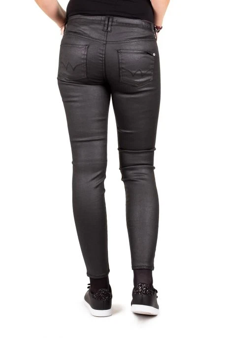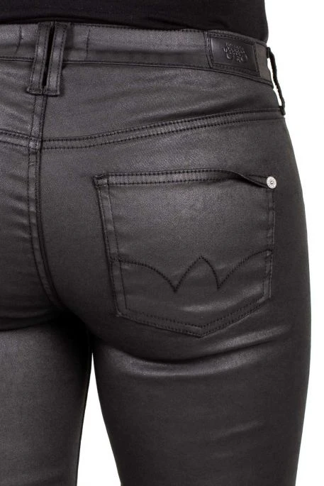 Jean TDC pour femme, jean noir en tissus enduit ultra stretch, coupe skinny, taille intermédiaire, coupe 7/8,