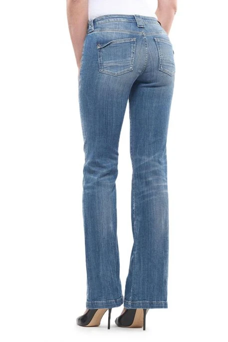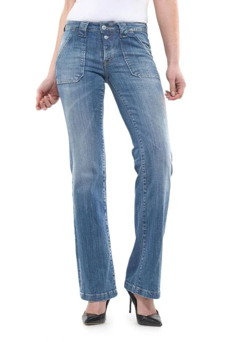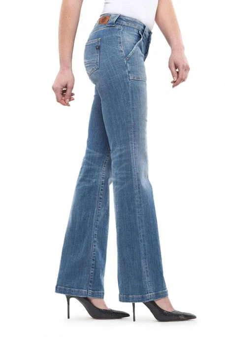Jean Le Temps des Cerises Flare pour femme. jean de taille intermédiaire, coupe flare très évasée du genou jusqu’en bas. Fermeture à boutons, 5 passants, poche arrière retournée, broderie Héritage sur l’intérieur de la ceinture.
