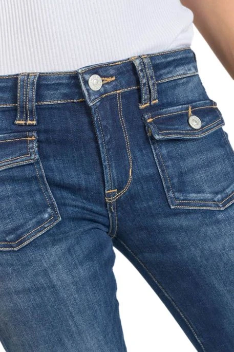 Jean pour femme de marque Temps des Cerises, ce jean possède une coupe flare, une taille normale, fermeture zippée + bouton, vous allez aimer son style avec ses 2 poches boutonnées sur le devant, ses doubles passants ceinture et son large ourlet sur le bas.