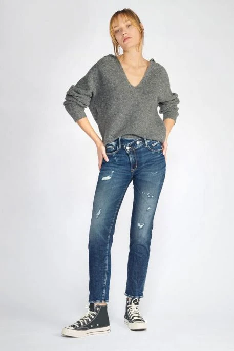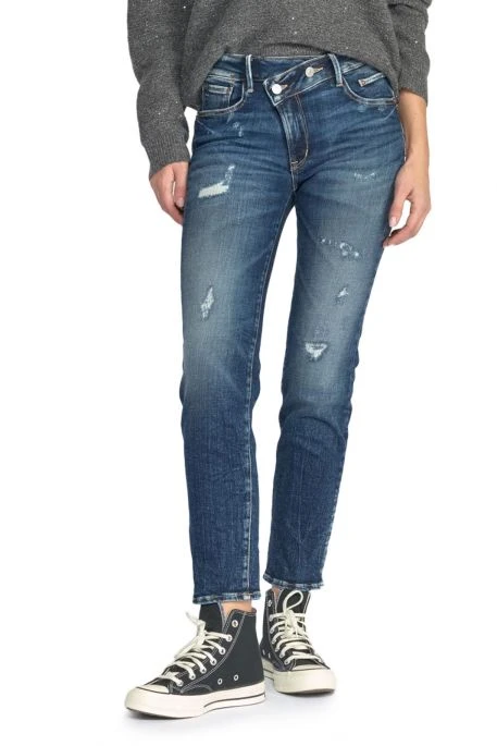 Jean Temps des Cerises pour femme, Jean coupe droite avec sa fermeture à boutons asymétrique, quelques déchirures sur le devant du jean pour un effet « destroy »