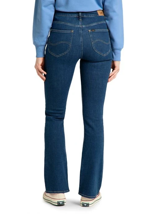 Jean Lee Breese pour femme. Jean taille haute, coupe ajustée du bassin, des cuisses jusqu’aux genoux, bas de jambe évasé. Fermeture par bouton et braguette zippée. Modèle 5 poches.