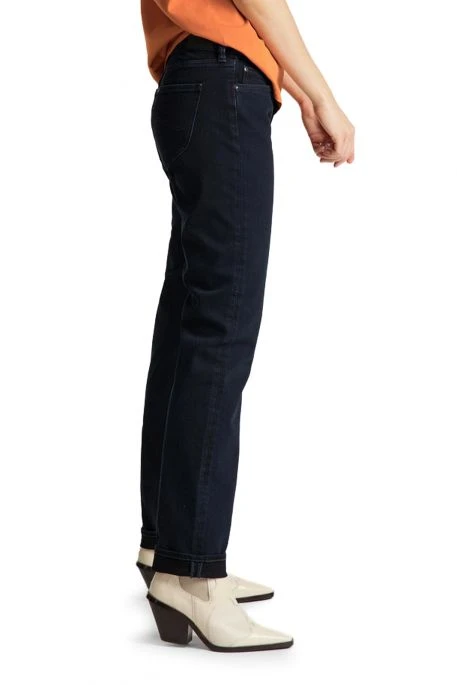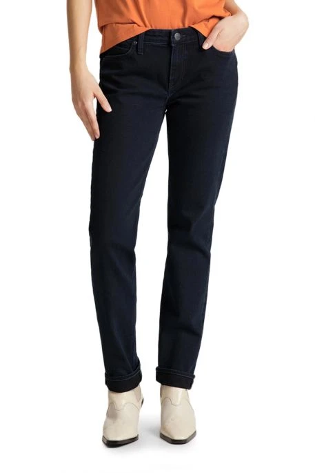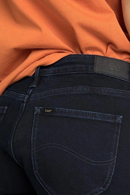 Jean Lee Marion Straight pour femme. Jean taille haute, coupe droite ajustée aux cuisses. Jean cinq poches, fermeture zippée. Très beau denim foncé, boutons argentés foncés, coutures sombres et un patch Jacron noir, coutures ton sur ton, bouton et rivets couleur or vieilli.