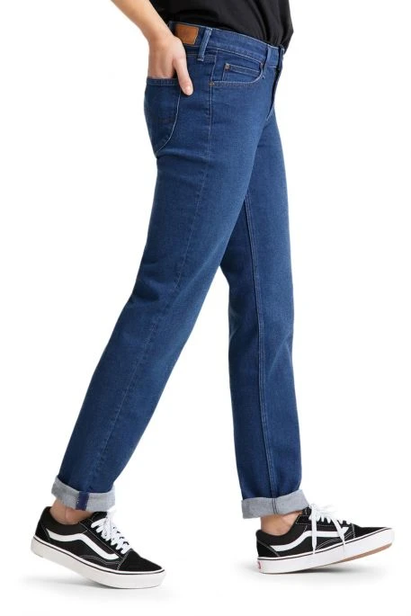 Jean Lee Marion Straight pour femme. Jean taille haute, coupe droite ajustée aux cuisses. Jean cinq poches, fermeture zippée. Très beau denim intermédiaire, coutures ton sur ton, bouton et rivets couleur or vieilli.