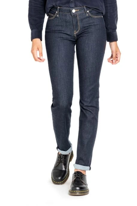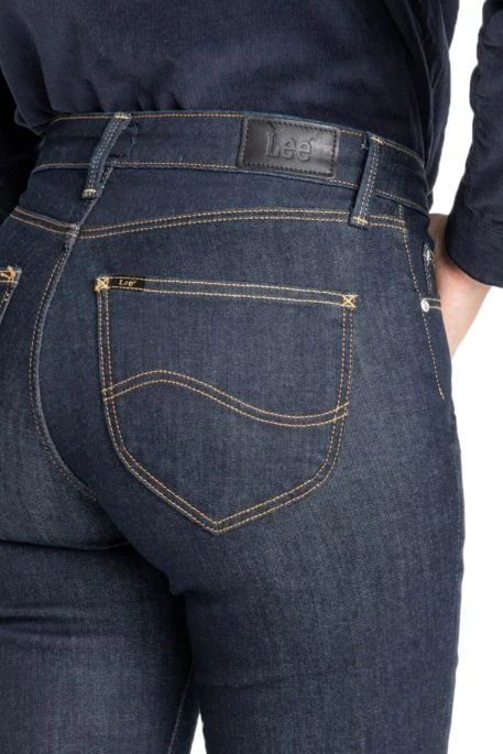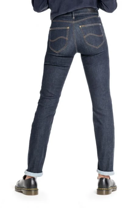Jean Lee Marion Straight pour femme. Jean taille haute, coupe droite ajustée aux cuisses. Jean cinq poches, fermeture zippée. Très beau denim foncé aux surpiqûres dorées contrastantes.