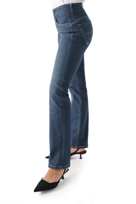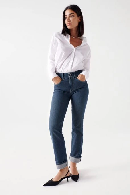 Jean Salsa Secret Push In pour femme. Jean de coupe droite, taille haute, fermeture par 2 boutons et braguette zippée. Jean 5 poches, Push-In qui produit un effet ventre plat et un maximum d’élégance. Coloris bleu verdâtre.