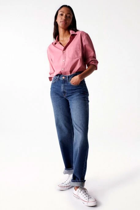 Jean Salsa pour femme. Jean True Redesign à la coupe slim avec jambes droite et taille haute. Bouton et fermeture éclair. Deux poches à l’avant et deux poches à l’arrière. Léger effet usé.
