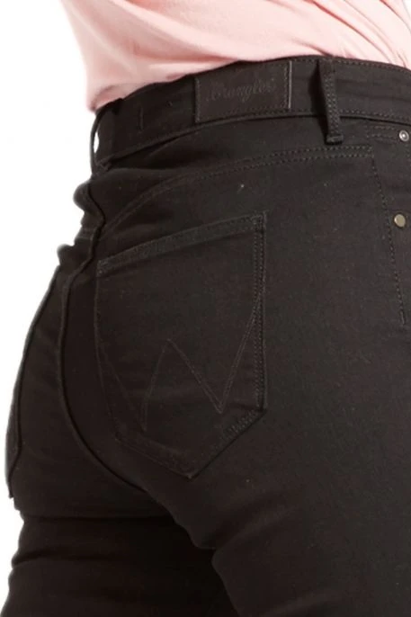 Jean Wrangler Med pour femme. Jean de coupe skinny, taille intermédiaire, braguette zippée. Denim noir stretch pour un meilleur confort.