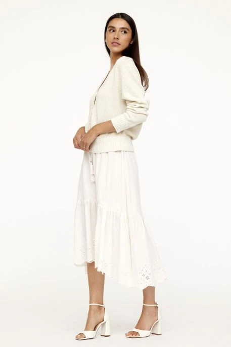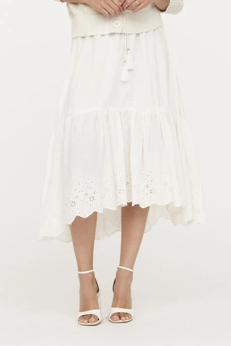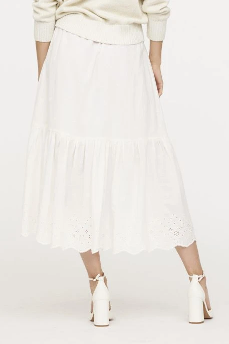 Jupe Lee Cooper Pala, jupe longue assymétrique en broderie anglaise, la ceinture est éléstiquée avec un cordon tressé, volants au bas de la jupe.