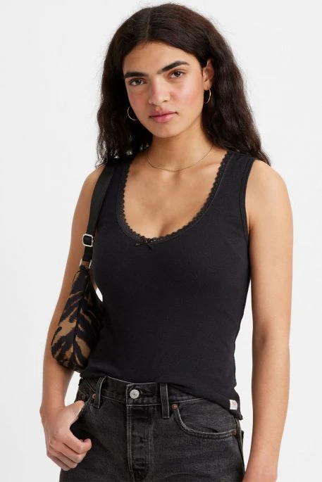 Débardeur Levi’s® pour femme, encolure en V, coupe ajsutée, débardeur avec un ourlet roulotté à effet ondulé, une bordure en dentelle et un petit nœud au milieur du col.