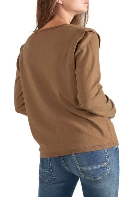 Pull Lily camel Le Temps Des Cerises pour femme. Pull à manches longues avec une maille fine. Col en V avec des fils brillants ton sur ton au niveau du col, des poignets et du bas du pull. Epaulettes très discrètes. Coupe droite.