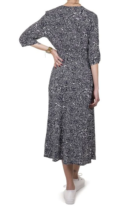 Robe Teddy Smith pour femme. Robe longue imprimée cache coeur col V. Manches 3/4. Robe élastiquée à la taille avec deux boutons pressions pour attacher le haut de la robe.