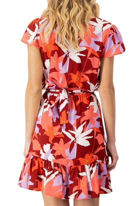 Robe Teddy Smith, robe avec encolure en V, manches courtes, robe avec imprimé floral sur fond rouge éclatant, ceinture à la taille,
