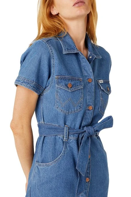 Robe longue de la marque Wrangler, robe macnhes courtes, fermeture boutonnée + ceinture à la taille, étiquette Wrangler sur la poche.