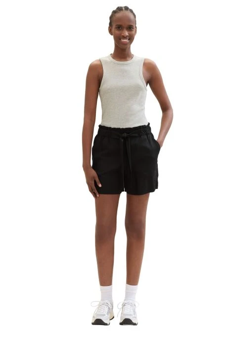 Short pour femme Tom Tailor. Short fluide ceinturé et élastiqué à la taille par un lien en tissus. 2 poches italiennes, 100% Lyocell. Coupe relaxed fit.