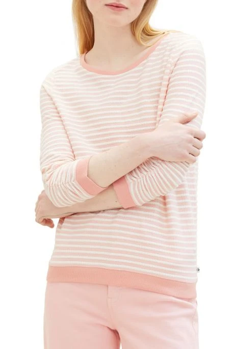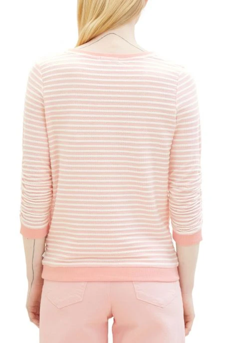 Sweat Tom Tailor pour femme, pull manches longues avec encolure ronde, manches 3/4, pull rayé avec coupe droite et poignets côtelés contrastés.
