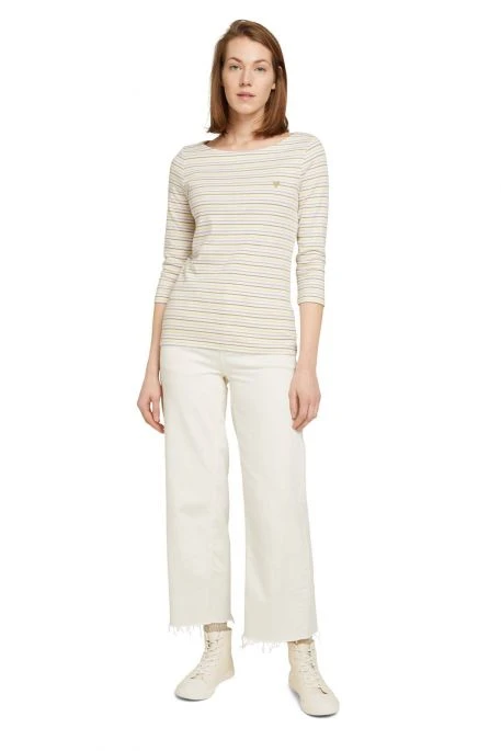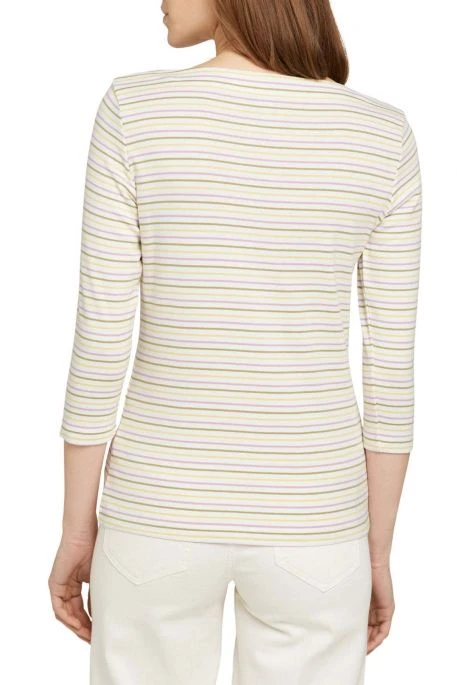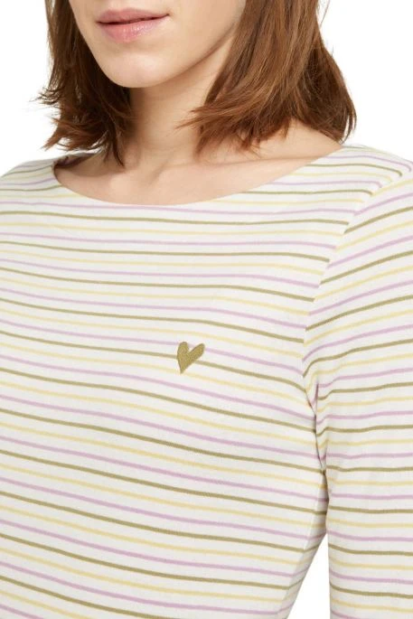Tee Shirt Tom Tailor pour femme, col rond, manche 3/4 rayé multicolore, coeur brodé sur la poitrine.
