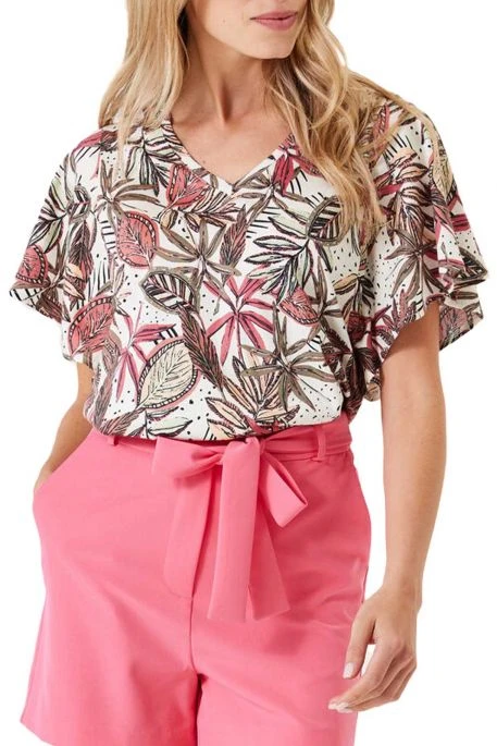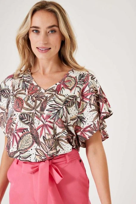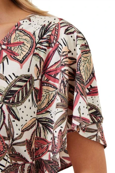 Tee-shirt Garcia imprimé pour femme. T-shirt de couppe classique, manches courtes chauve-souris, col en V. Tissu intégralement imprimé.
