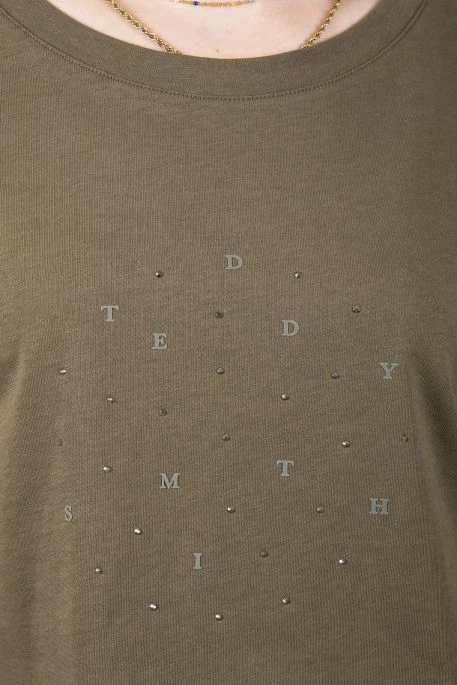 T-shirt Teddy Smith pour femme. Tee shirt manches courtes et col rond. Imprimé strass sur le devant, coupe classique. Matière 100% coton et disponible dans d’autres coloris. Ce vêtement possède le label OEKO-TEX qui garantit un processus de fabrication certifié et contrôlé, respectueux de votre peau.