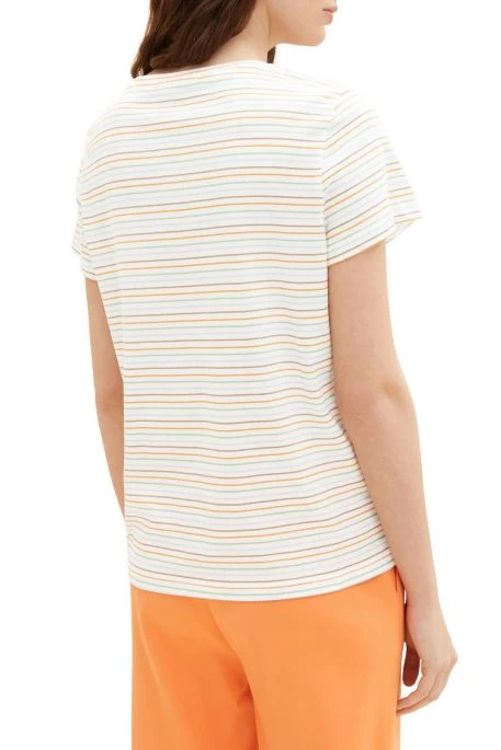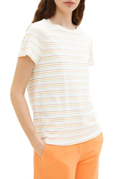 Tee Shirt Tom Tailor rayé pour femme, tee shirt manches courtes avec encolure arrondie, coupe slim fit, confectionné en 100% coton