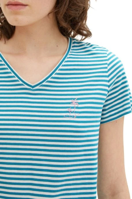 Tee Shirt Tom Tailor pour femme, tee shirt avec encolure en V, manches courtes, tee shirt rayé à l’esprit marin avec un palmier brodé, la coupe est regular